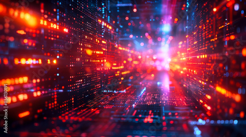 Digital Big Data Stream Background. Abstract image of a high-tech digital data stream in vibrant red and blue hues, representing fast data transfer and futuristic technology.