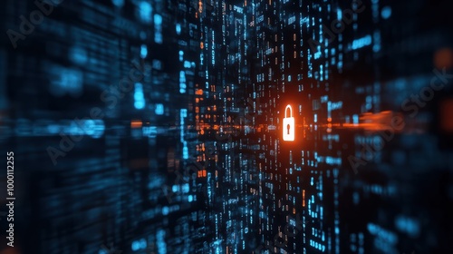 Digital binary code screen with a lock icon, emphasizing strong cybersecurity measures and data protection in a tech driven environment