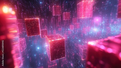 Digital blocks representing blockchain data moving through cyberspace with vibrant lights