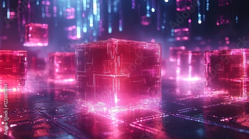 Digital blocks representing blockchain data moving through cyberspace with vibrant lights