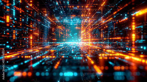 Digital blue orange black matrix, futuristic digital data network, virtual cyberspace, electronic information grid