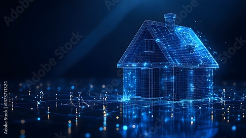 Digital blueprint of a modern home. A floating wireframe house design with glowing lines showcases futuristic architecture. Network nodes suggest connectivity. Abstract wireframe in dark blue.