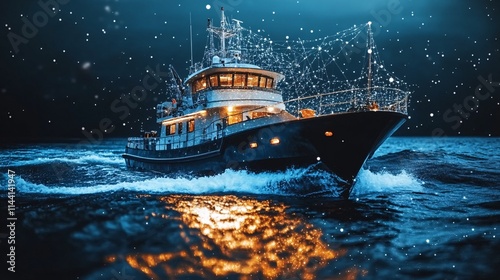 Digital boat with AI technology on the water, representing smart navigation, marine exploration, and environmental monitoring in modern transportation.