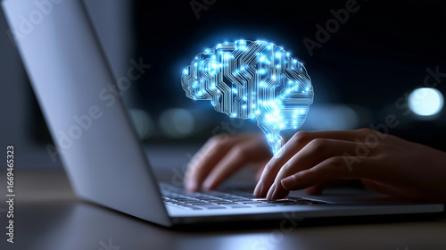 Digital brain hologram emerging from a laptop, symbolizing artificial intelligence, machine learning, and modern computing power.