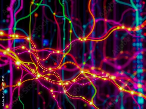 Digital Brain Network: A complex, glowing network of interconnected lines and nodes pulsates with vibrant colors, symbolizing data flow and connectivity.