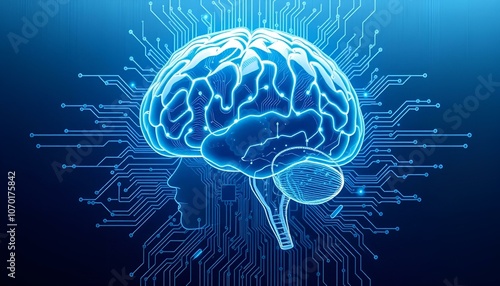 Digital brain with circuit patterns, futuristic technology concept, blue neon colors