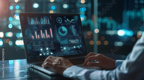 Digital business marketing data management on virtual screen, Businessman use laptop work marketing analysis chart strategic planning analytics dashboard with management data work in modern office