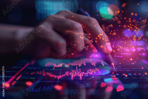 Digital businessman hand drawing growth graphs and financial data with hologram charts.