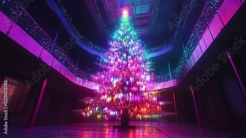 Digital Christmas tree in a modern loft, ornaments flickering in a rainbow of programmable hues, glowing holographic snowflakes floating, Sci-Fi, Neon, High-Detail