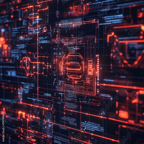 Digital Circuitry Design Featuring Vibrant Red and Blue Hues in an Abstract Layout, Showcasing the Intricate Connections and Data Pathways in Modern Technology