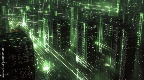 Digital Cityscape Abstract Futuristic Data Center Network with Glowing Green Connections.