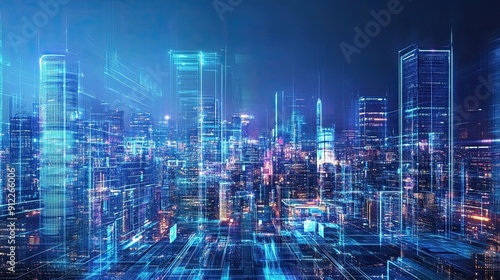 Digital Cityscape with Glowing Blue Lines and Grids