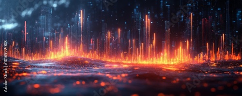 Digital Cityscape with Glowing Orange Lines and a Dark, Textured Foreground