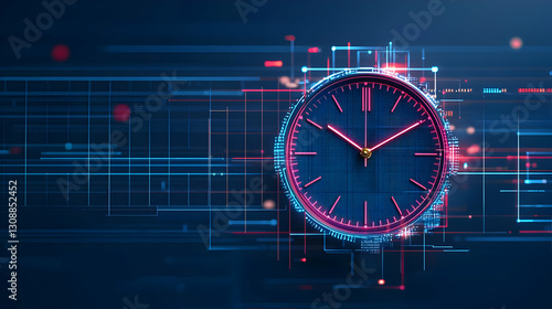 Digital Clock Displaying Time Amidst Data Streams and Technological Network in Blue and Red Hues