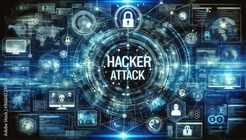Digital collage of cybersecurity concept with "HACKER ATTACK" text and security icons on blue background.