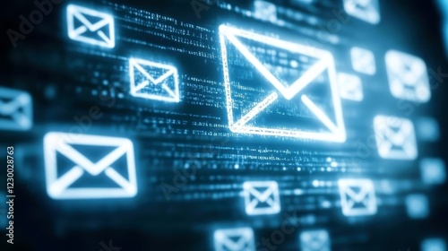 Digital communication concept, glowing email icons against a dark background, emphasizing connectivity and modern tech themes.