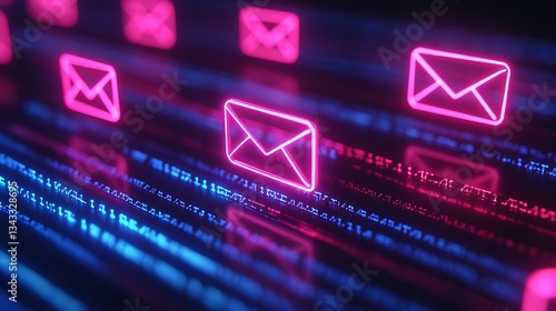 Digital Communication Concept with Neon Email Icons and Binary Code in Futuristic Background