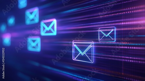 Digital Communication Concept with Neon Email Symbols and Binary Code Background in Technology Environment