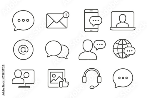 Digital communication social media line icon set. Thin line editable stroke icons for messaging, remote work, online meetings, internet chat, online content, customer support.