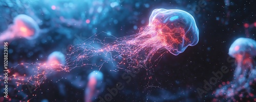 Digital cosmos featuring an ethereal AI entity, illuminated circuits, and neural network tendrils, with flowing abstract data streams in a holographic interface
