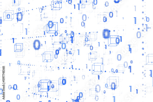 Digital cubes and binary numbers in blue color scattered on a clean white background, showcasing a virtual cyberspace technology concept. 3D Rendering.