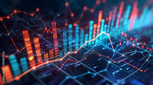 Digital Data Visualization Showing Upward Trend Of Financial Growth With Red And Blue Graphs