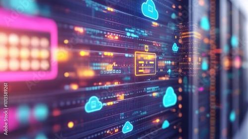 Digital data visualization with cloud icons and server elements.