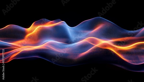 Digital data wave in orange and blue, flowing lines of light, hightech futuristic style, deep dark background, vibrant motion