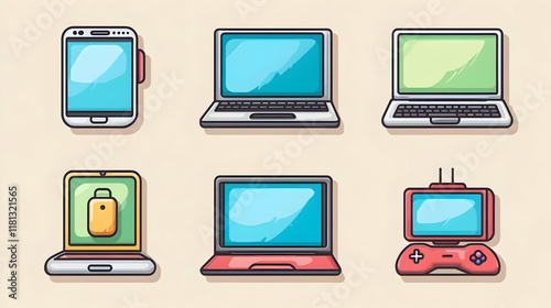Digital Devices Collection Smartphone, Laptops, and Game Controller Illustration on Beige Background.
