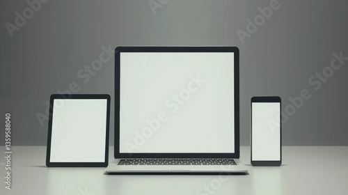 Digital devices displayed on a solid surface modern technology showcase minimalist environment front view