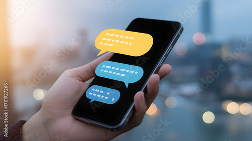 Digital Dialogue: A hand delicately holds a smartphone, its screen illuminated with vibrant speech bubbles, showcasing the immediacy and connectedness of modern communication in a compelling.