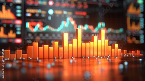 Digital display of a stock market chart with glowing bars and graphs against a dark background.