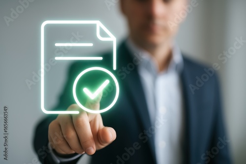 Digital Document Approval: A modern professional's hand interact with a glowing digital document, highlighting the seamless process of confirmation and approval.