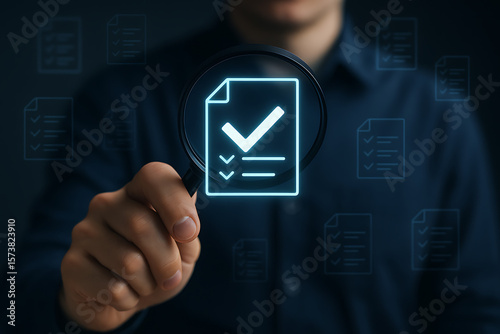 digital document validation, quality assurance, document auditing, magnifying glass, digital checklist, document review, audit icon, compliance check, inspection, digital QA, modern auditing, quality