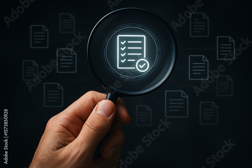 digital document validation, quality assurance, document auditing, magnifying glass, digital checklist, document review, audit icon, compliance check, inspection, digital QA, modern auditing, quality