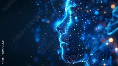 Digital face profile glowing with blue light dots representing artificial intelligence and technology