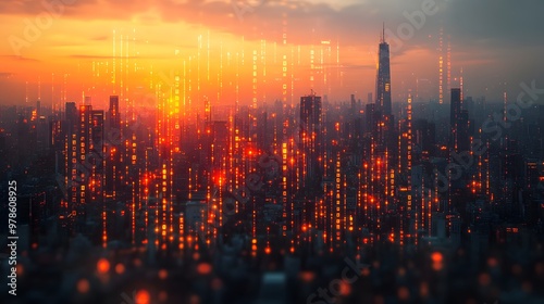 Digital financial chart interface over a hazy cityscape, showcasing modern trading and economic trends.