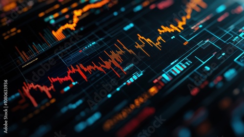 Digital financial stock market board with graphs displaying trends in vibrant lights.