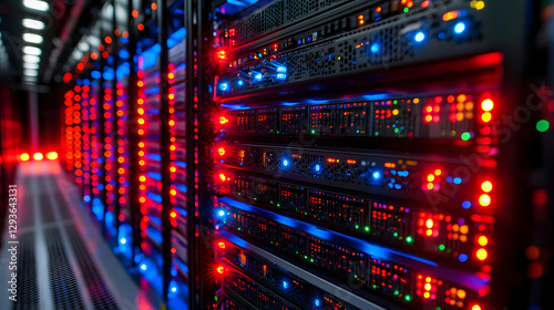 Digital Fortress: Illuminated rows of servers, emitting an ambient glow of red and blue light, creating an advanced digital environment, capturing the essence of modern data storage.