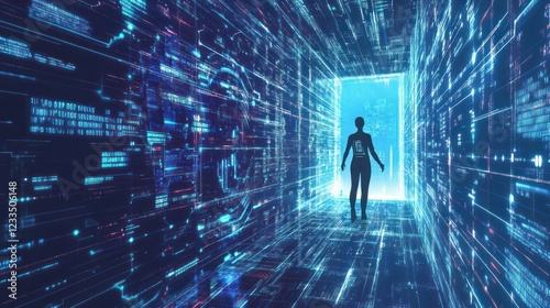 Digital Frontier: A Silhouette of a Person Walking Towards a Bright Future in a Cybernetic Corridor