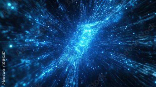 Digital frontier, glowing particles stream through a network, abstract data flow