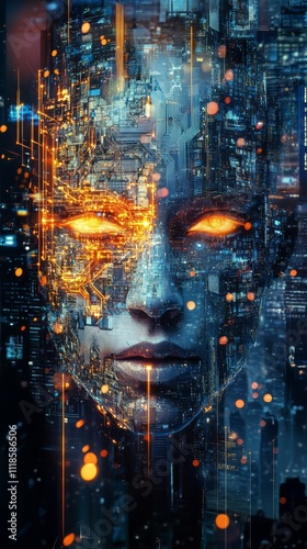 Digital Fusion: A surreal and captivating image of a human face interwoven with a cityscape, showcasing the merging of technology and human existence, a powerful visual metaphor for the digital age.