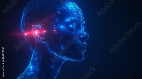 Digital, futuristic representation of a human profile with glowing blue lines and red accents on a dark background