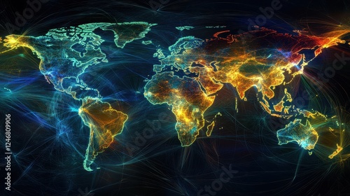 Digital globe with connected trade routes, global network, world trade.