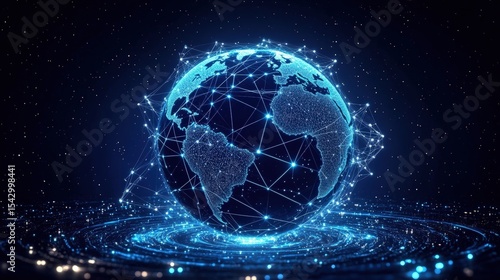 Digital globe with interconnected nodes and lines representing global network and data exchange on a dark background.
