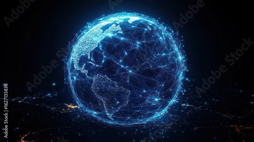 Digital glowing globe showing continents of North and South America connected by a complex network of luminous blue lines and nodes symbolizing global connectivity and communication