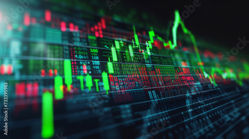 digital graphical representation of a stock market with fluctuating graphs, numerical data, and upward and downward trends, indicating financial analysis or stock trading activity.