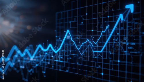 Digital growth chart, rising graph, futuristic interface, glowing lines on dark background