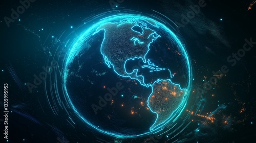 Digital holographic Earth with neon outlines, glowing energy field, futuristic tech-inspired deep space setting.