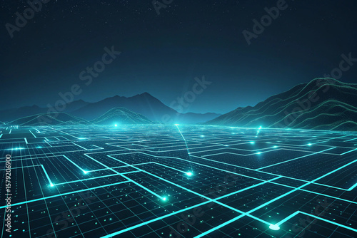 Digital Horizon: A futuristic panorama blends the organic with the technological, showcasing an abstract landscape where digital lines weave across a serene environment.